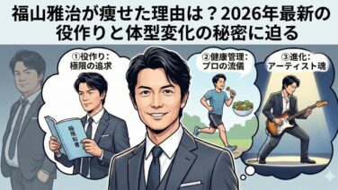 福山雅治が痩せたと言われる理由は?2026年最新の体型変化の裏にある、新作に向けたストイックな役作りと、年齢を味方につける健康管理術。激痩せの噂を「心配」から「期待」へと変える、プロフェッショナルな意図と進化する魅力を専門家が徹底解説します。