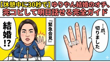 エンタメ 【休憩中に30秒で】ゆりやん結婚のオチ、完コピして明日話せる完全ガイド 「ゆりやん結婚!?」と驚いた方へ。結論、それは大谷翔平選手の発表直後に投稿された、最高の「ネタ」でした。左手薬指の指輪を見せて語った衝撃のオチ「爪切りました」の全貌と、なぜこれが神業と絶賛されたのかを解説。明日職場で絶対にウケるトーク術まで教えます。 2026.02.06 エンタメ