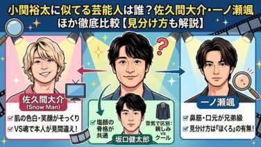 タレント 小関裕太に似てる芸能人は誰?佐久間大介・一ノ瀬颯ほか徹底比較【見分け方も解説】 小関裕太に似てると話題の芸能人を徹底比較!佐久間大介・一ノ瀬颯・坂口健太郎との共通点と見分け方をわかりやすく解説。本人が見間違えた伝説エピソードも紹介。 2026.04.02 タレント