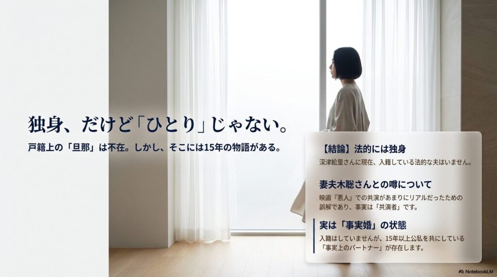まず、戸籍上の事実として、深津絵里さんと「旦那(法的な夫)」はイコールではありません。 彼女はデビュー以来、一度も入籍をしたことはなく、現在も独身です。