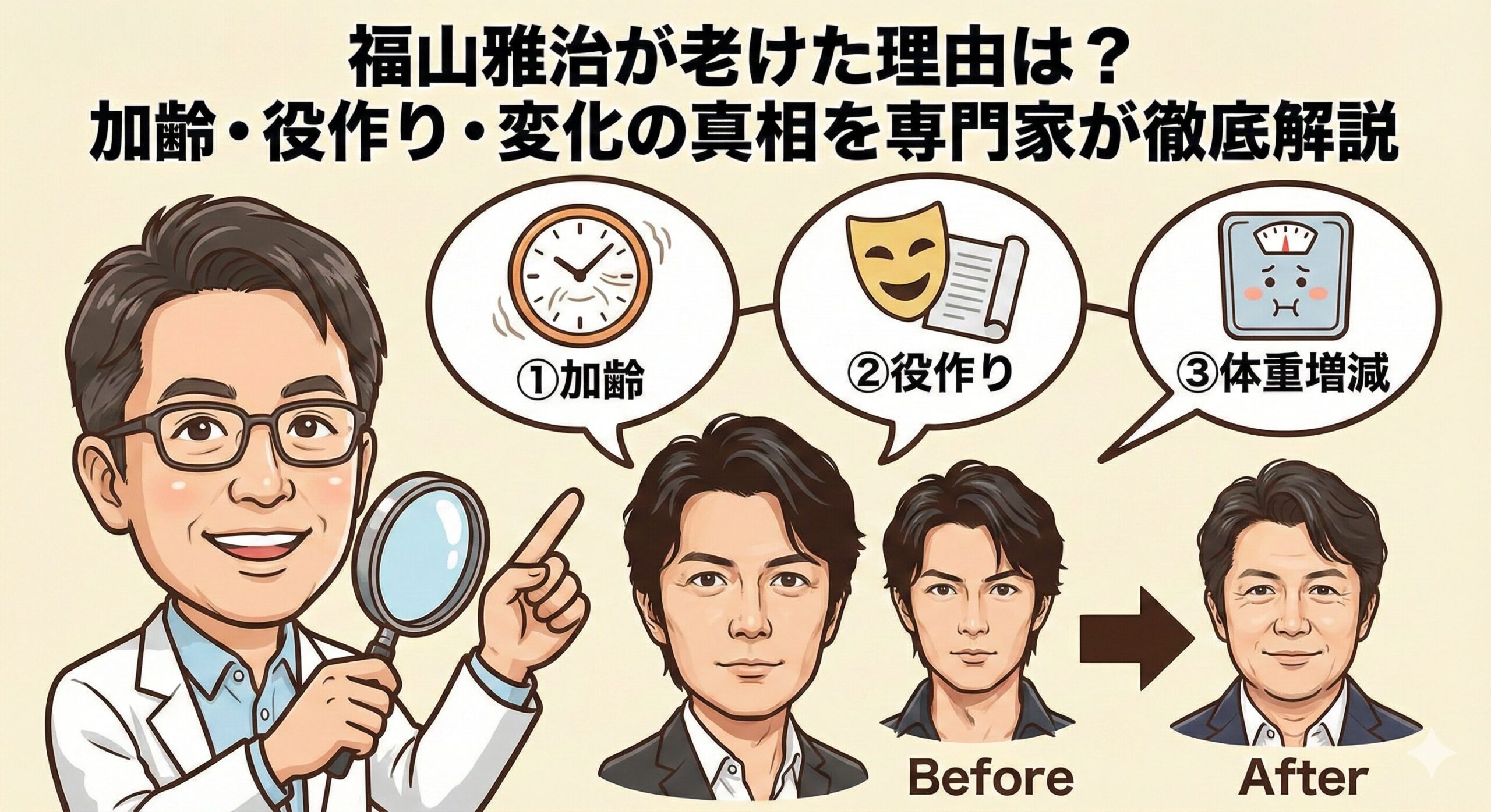 では、なぜ福山雅治さんの印象はこれほどまでに変化したのでしょうか。単刀直入に結論からお伝えすると、その正体は「①加齢」「②役作り」「③体重増減」という3つの要因が、ごく自然に重なり合った結果です。