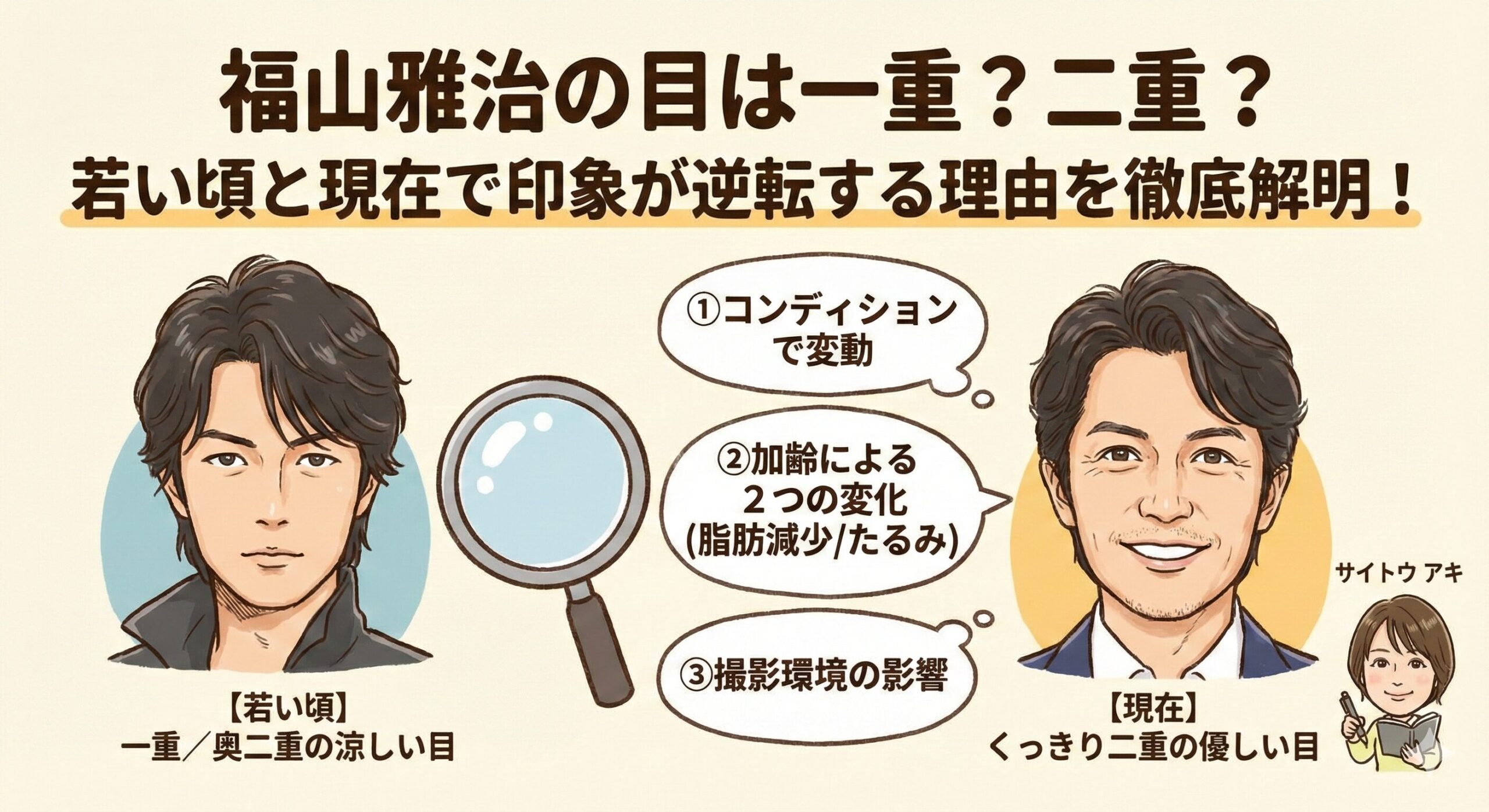 つまり、見る時期によって、福山さんの目元は「二重が深くなったり」「逆に隠れたり」という両方の変化を経験してきたため、「昔は二重だった」「最近一重に見える」という、一見矛盾した全ての感想が、それぞれ正しい印象を捉えているのです。