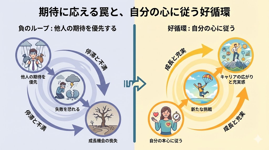 私たちも日々の業務で、上司の期待に応えようと無理をしてしまうことがあります。他人の評価ばかりを気にして自分の本心を押し殺すことは、長期的なキャリアにおいて大きなマイナスになりかねません。