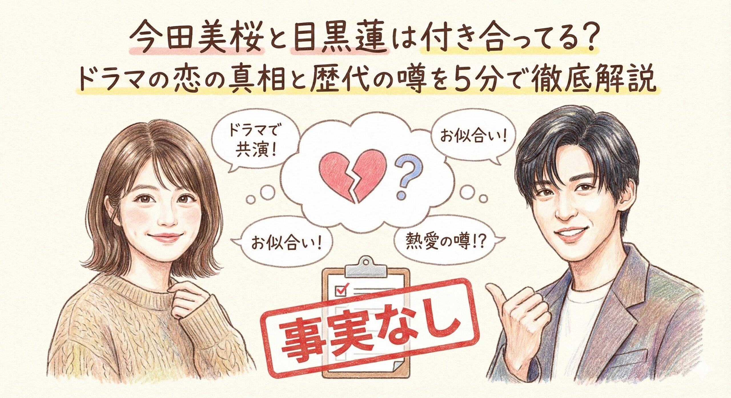 この記事では、なぜ二人の熱愛の噂が広まったのかという背景から、他の歴代の噂の真相まで、ネットの曖昧な情報をスッキリ整理し、確かな情報と噂の境界線がはっきりわかるように解説します。読み終える頃には、安心して二人の今後の活躍を応援できるようになりますよ。