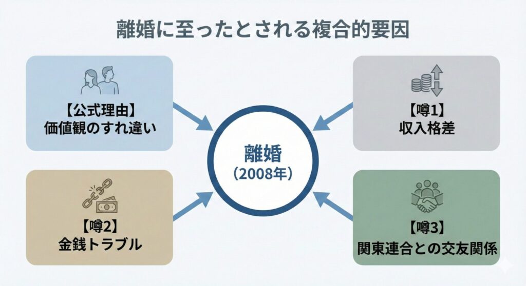 - 離婚の真相: 公式理由は「価値観のすれ違い」ですが、背景には収入格差や交友関係など、複数の要因が噂されました。