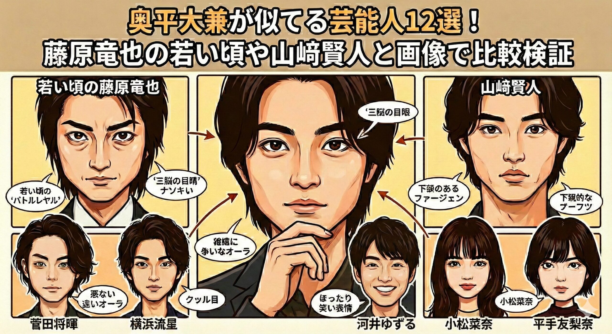奥平大兼さんが似ていると言われる筆頭は、なんといっても若い頃の藤原竜也さん。しかし、実はそれだけではありません。正統派イケメンの山﨑賢人さんや、なんと意外な芸人さんまで、彼の顔立ちには「スターたちの共通点」が隠されているのです。