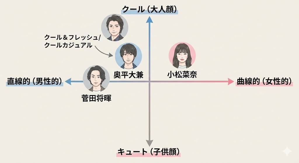 - 対抗の正解: 骨格美なら山﨑賢人、雰囲気なら菅田将暉。