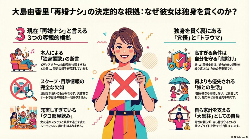 結論から言うと、大島由香里さんは現在、再婚していません。