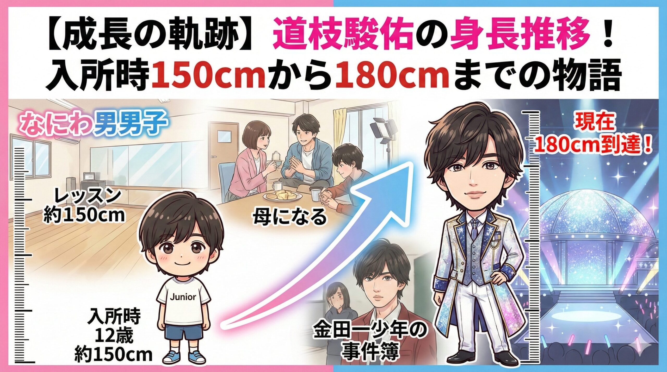 入所時の150cmから現在の180cmまで、その30cmの成長は、彼がトップアイドルへと駆け上がってきた努力の証そのものです。