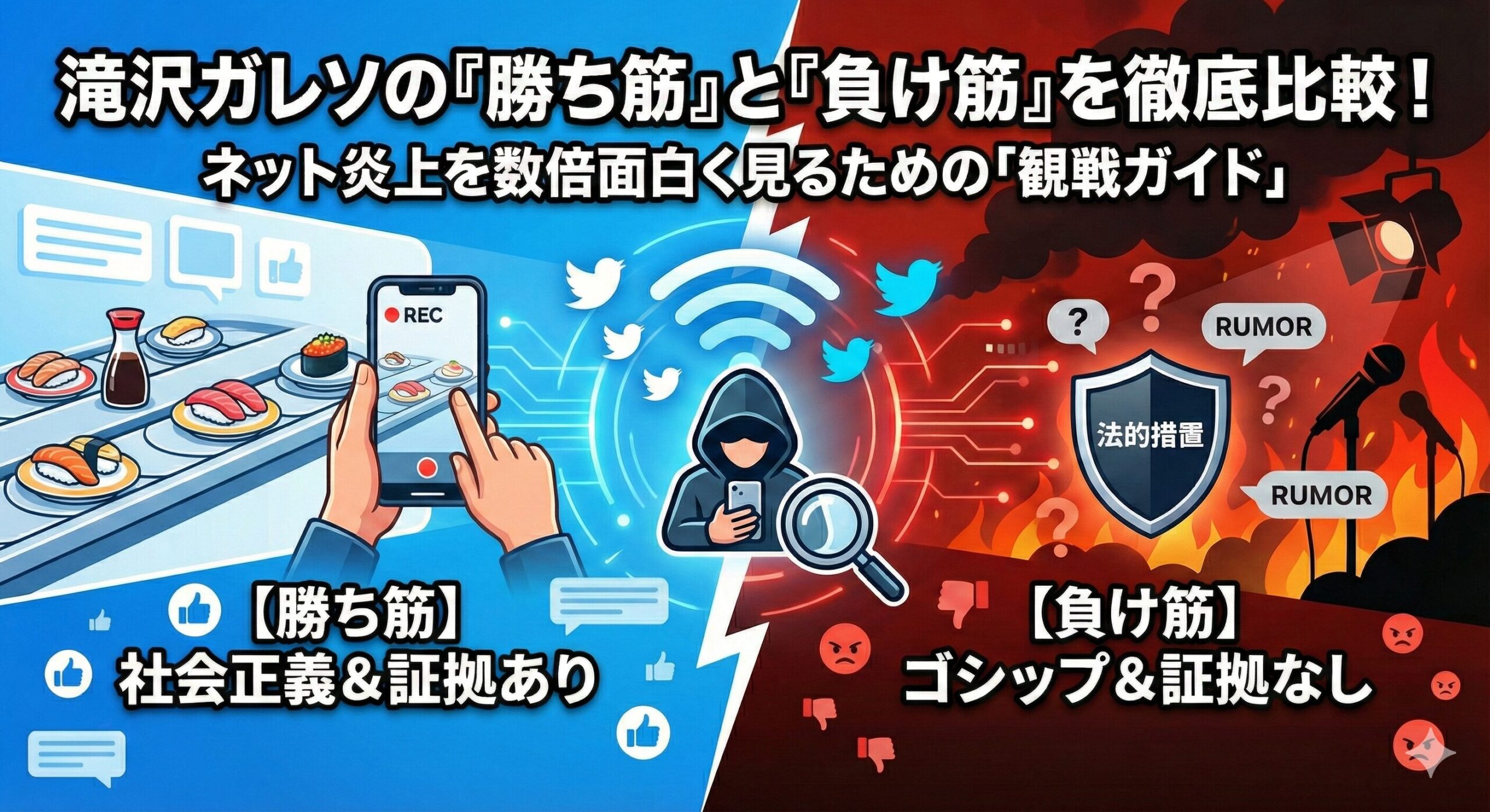 この記事は、単なる事件のまとめではありません。スシロー事件と星野源事件を徹底比較し、滝沢ガレソの「必勝パターン」と「大失敗パターン」を解き明かすことで、あなたが今後の炎上騒動を数倍面白く見れるようになる「観戦ガイド」です。読み終えれば、あなたもネットの動の裏側を見抜けるアナリストです。