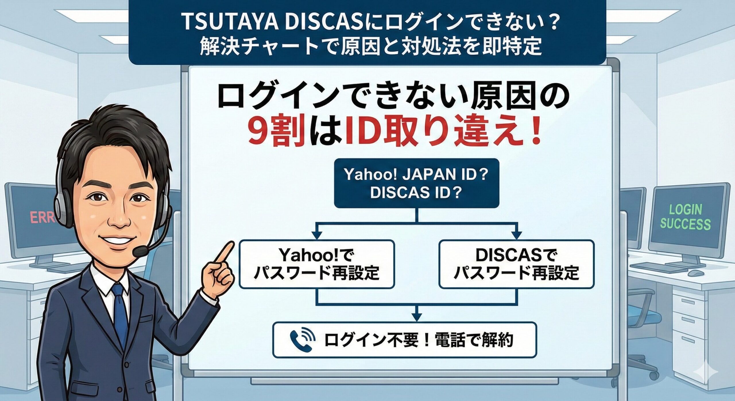 この記事では、年間500件以上のログイン不具合を解決してきたテックサポート・コンシェルジュの知見に基づき、1分で原因を特定できる診断フローチャートを作成しました。この記事を読み終える頃には、あなたはログインできない迷宮から抜け出し、スッキリした気持ちで観たかった作品を予約できているはずです。万が一の際のログイン不要で進められるTSUTAYA DISCASの解約手順(休会との違い・無料期間の注意点)まで網羅していますので、安心して読み進めてください。