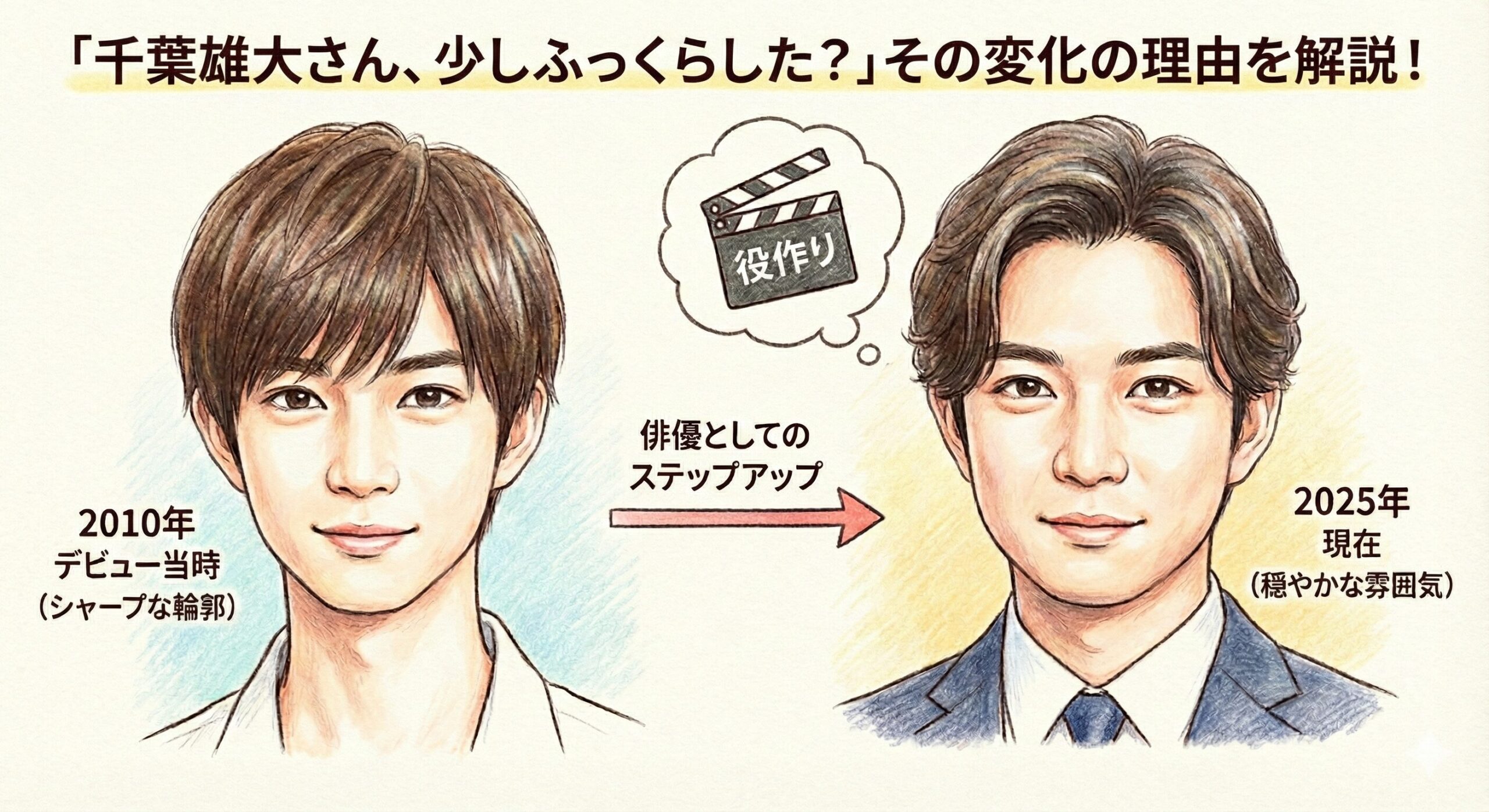いかがでしょうか。デビュー当時の、触れたら切れそうなほどのシャープな顎のラインと、現在の穏やかで優しい雰囲気の輪郭。千葉雄大さんの外見が変化したことは一目瞭然です。